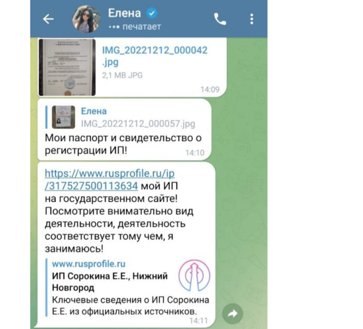Изучив историю обманутых клиентов, оказалось, что Елена имеет официально зарегистрированный статус индивидуального предпринимателя. По ее замыслу, данный момент должен у клиентов вызвать доверие к ней, однако этого не произошло.