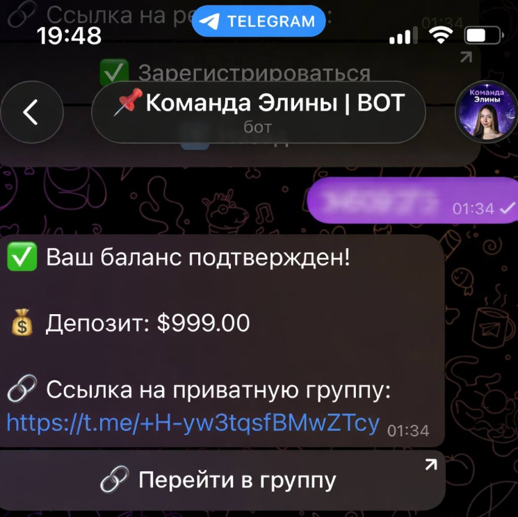 Одной из особенностей указанного сервиса является то, что получить ID пользователь может только после пополнения счета. Соответственно, человеку не нужно платить трейдеру, но потребуется обязательно внести деньги на незнакомую площадку. Далее полученный номер следует отправить Эле в личные сообщения и она даст ссылку на приватную группу. Выглядит все не очень просто, но достаточно сомнительно.