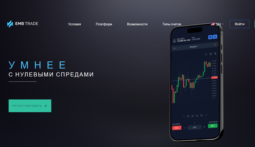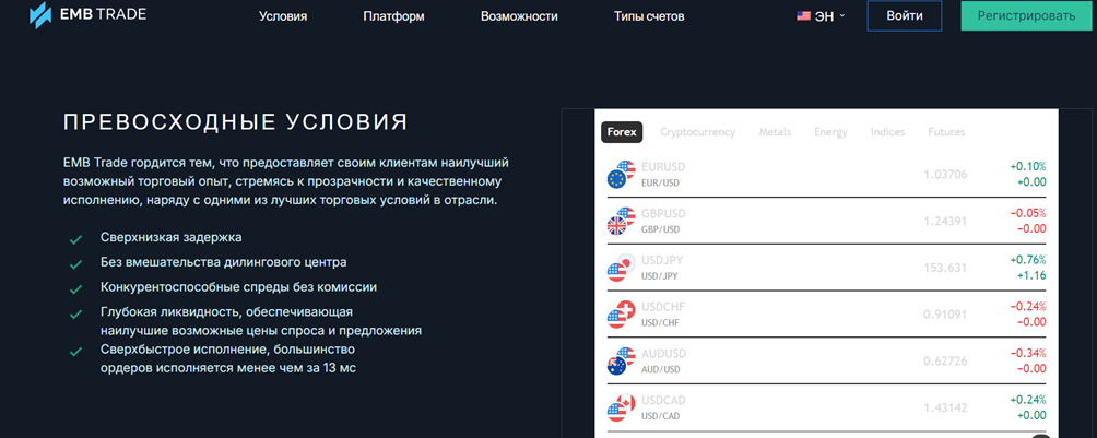 Платформа Emb Trade выглядит слишком просто и похожа на множество мошеннических сайтов. На главной странице мы видим разделы: «Условия», «Платформа», «Возможности», «Типы счетов».