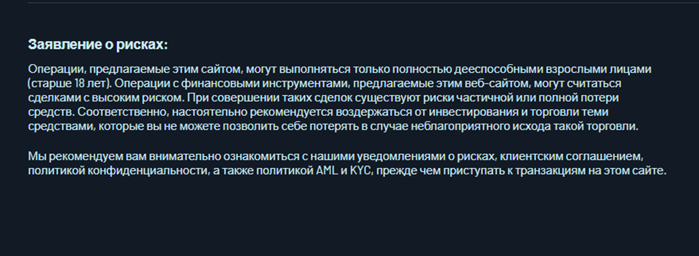 В конце страницы Emb Trade Org мелким шрифтом предупреждают о рисках. Здесь говорится, что брокер не несет ответственность за частичную или полную потерю денежных средств клиентов. Пользователям советуют перед проведением операций ознакомиться с политикой конфиденциальности и соглашением.