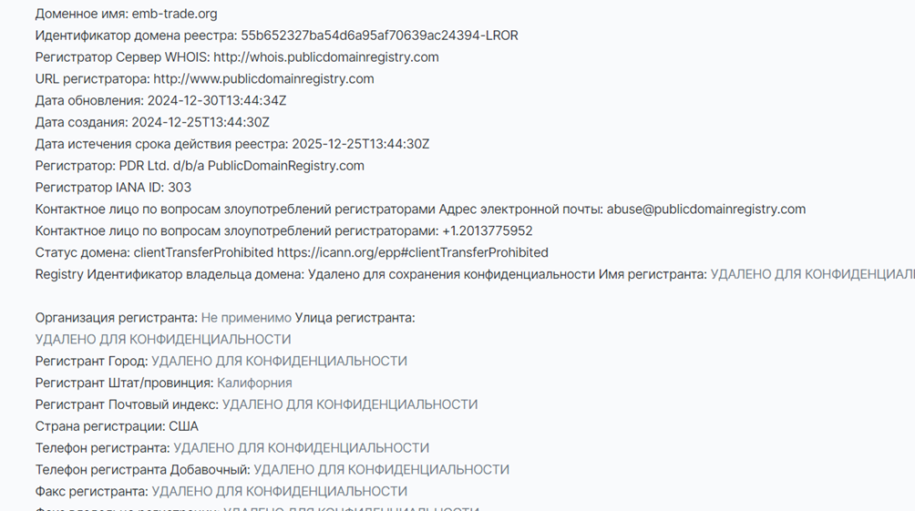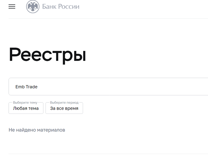 Emb Trade заявляет о пятнадцатилетнем опыте работы, но проверка доменного адреса опровергает это заявление. Сайт был создан в декабре 2024 года, а значит платформа функционирует совсем недавно. Срок действия закончится в декабре 2025 года. Видно, что брокер не нацелен на долговременную работу.Каждый участник финансового рынка должен иметь лицензии и разрешения от регуляторов. На сайте мы не нашли ни одного представленного документа, который бы указывал на законность действий платформы. В реестре Центробанка РФ брокер Emb Trade Org не числится. Платформа осуществляет свою деятельность на территории России незаконно.