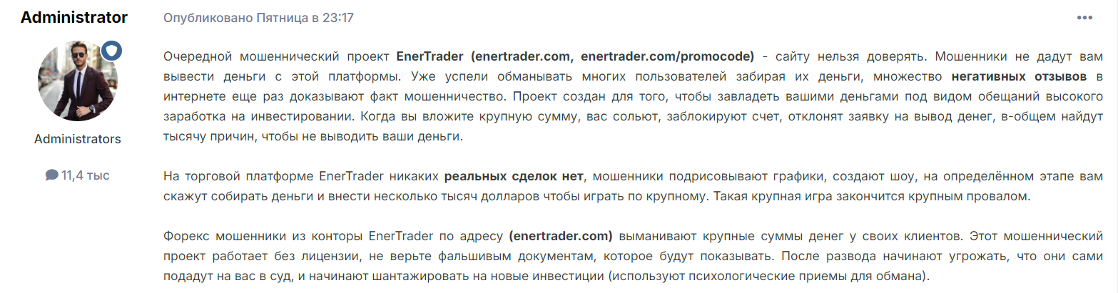 Работа на Enertrader com связана с серьезными финансовыми рисками. Компания отказывает клиентам в выводе средств, оказывает финансовое давление на клиентов и прописывает условия работы. Учитывая всю полученную информацию, мы не можем рекомендовать данного брокера в качестве надежного биржевого помощника.