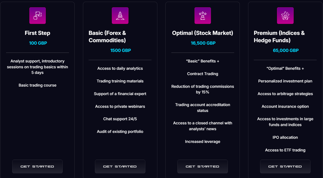 - Optimal – пополнение счета от 16,5 тысяч фунтов, доступ к закрытому аналитическому каналу, торговля контрактами;