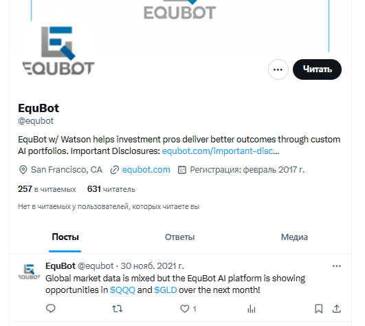 Домен equbot com зарегистрирован с 2016 года.Социальные сети у компании практически не развиты. Например, в твиттере, последний пост выложен 4 года назад.