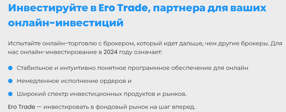 Брокер Ero Trade якобы предлагает пользователю «широкий спектр инвестиционных продуктов», которые позволят ему «быть на шаг впереди», инвестируя в фондовый рынок. Однако трейдеры сообщают, что за этими красивыми фразами скрывается обыкновенный обман. Давайте выясним, как именно мошенники разводят людей и почему от них лучше держаться подальше.