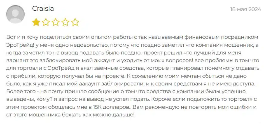 Клиенты оставляют плохие комментарии про «Эро Трейд». Один из них отправил заемные средства на депозит этой площадки, но мошенники заблокировали его аккаунт. Сумма потерь составила $15 тыс.