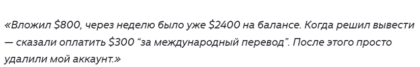 Второй трейдер пострадал по аналогичной схеме. Он положил деньги на депозит, однако снять их не удалось. Скамеры потребовали заплатить комиссию «за международный перевод», а потом пропали со связи.