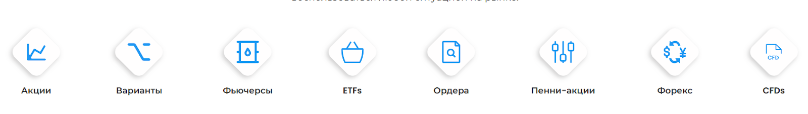 Судя по информации на сайте, трейдеру на платформе доступны акции, валюты, криптовалюты, фьючерсы и другие финансовые инструменты. Такой богатый выбор можно считать преимуществом платформы.