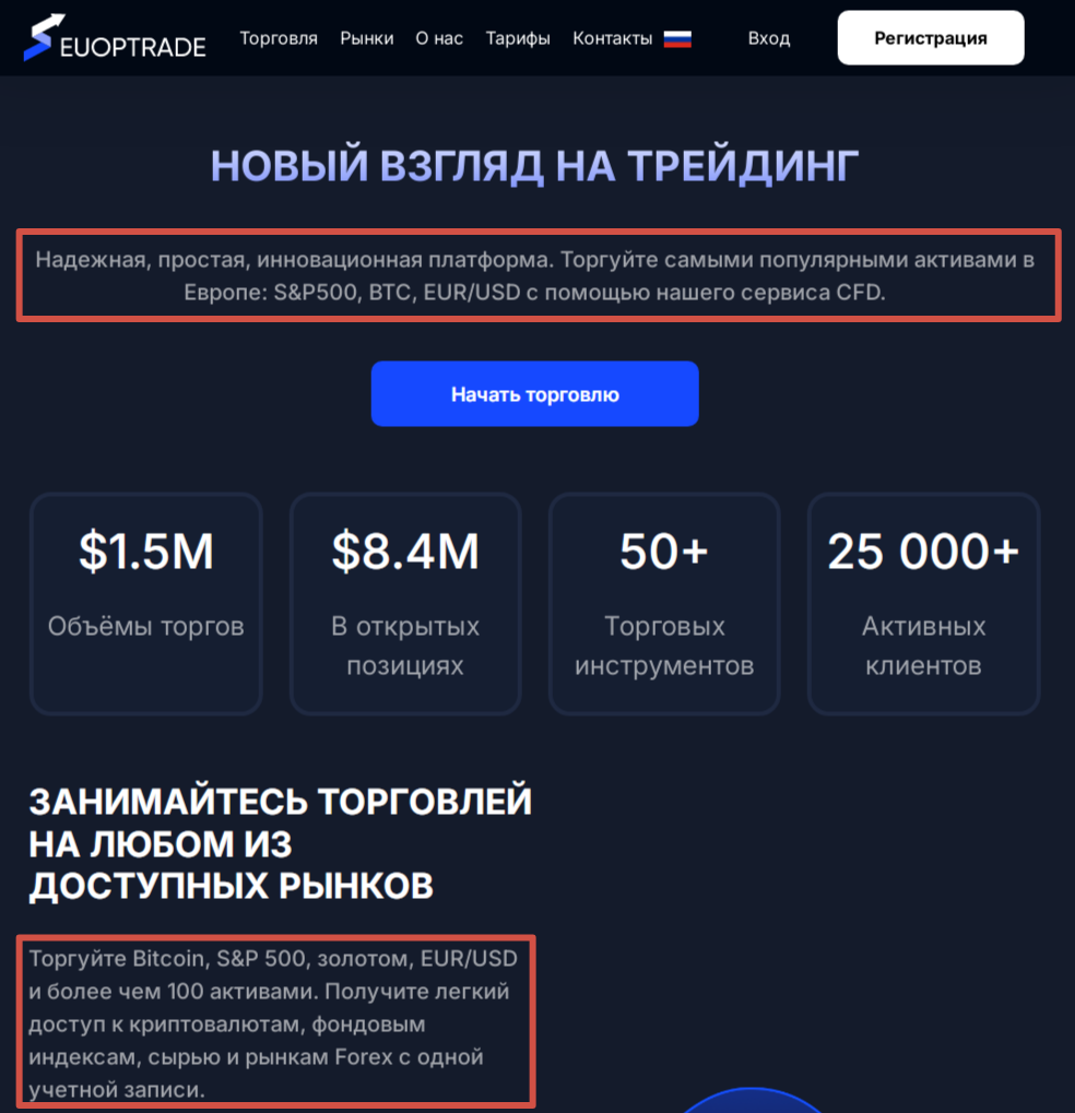 Euoptrade Com отзывы — ведущая брокерская компания, которая предоставляет клиентам комфортные условия и большие возможности для торговли на крипторынках. Также руководство гарантирует быстрые операции и обещает предоставить инновационные решения. Но в сети у данного ресурса слабая репутация.
