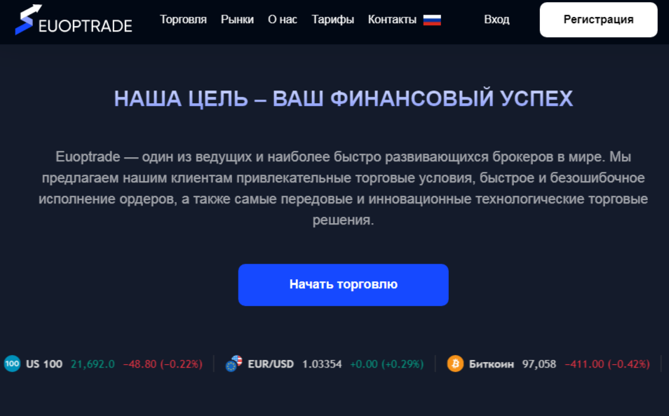 Как рассказывается на странице брокера euoptrade com, он является одним из ведущих сервисов. Разработчики предлагают пользователям выгодные торговые условия, быстрые операции и самые современные решения.