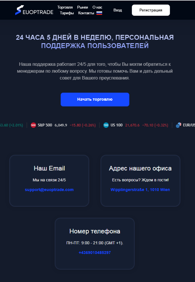 По словам основателей euoptrade com, их служба поддержки работает круглосуточно только 5 дней в неделю и только для клиентов. Остальных пользователей они принимают с понедельника по пятницу с 9:00 до 21:00 GMT+1 по сотовому номеру +4369010485297.