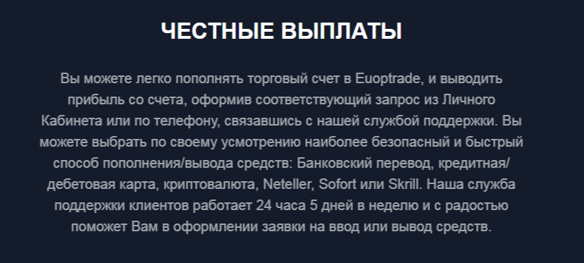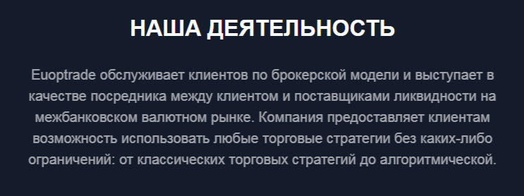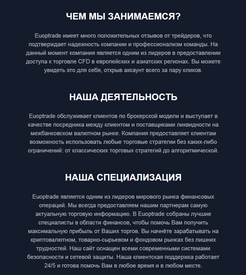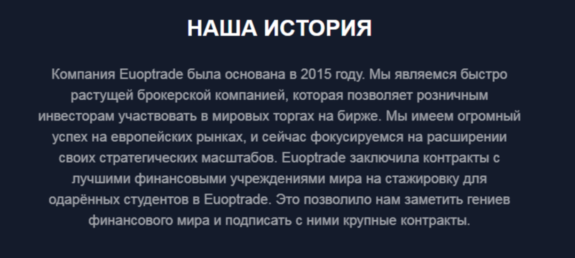На официальном сайте euoptrade com у нас не получилось увидеть отдельный раздел с историей проекта. Но мы нашли блок с краткой информацией о фирме.