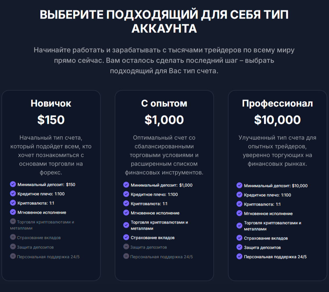 Торговля криптовалютой и металлами доступна только для 2 и 3 тарифа. Также авторы делают пометку, что они являются лишь посредником между трейдером и поставщиками ликвидности.