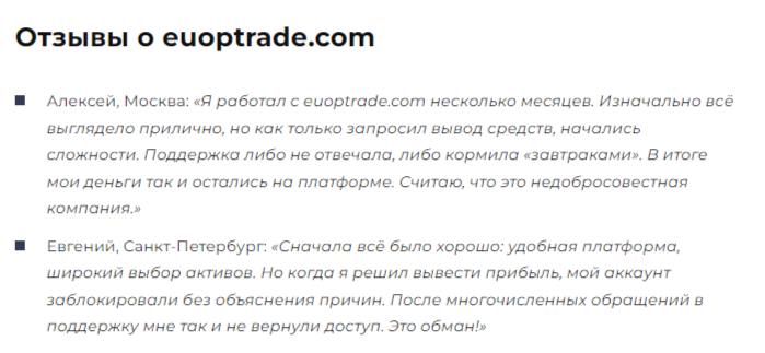 - отсутствие положительных отзывов о euoptrade com на просторах интернета.