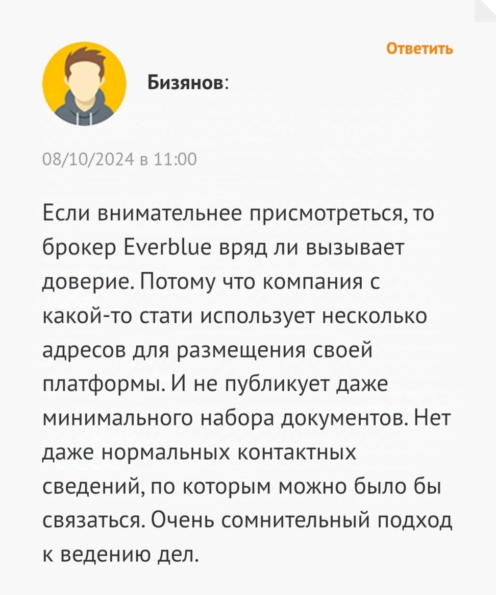 Компания ever blue today является ненадёжной и от сотрудничества лучше воздержаться. На это указывает несколько факторов: