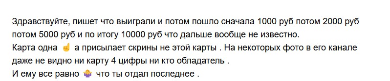 - Скрины с отзывами переписок от выигравших, вероятно, фейковые и даже в них нет ясности насчет того, что они получили деньги, поэтому, вполне возможно, потенциальный участник их не получит.