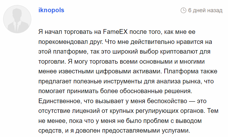 На сторонних ресурсах также была обнаружена негативная обратная связь. В отрицательных отзывах люди утверждают, что FameEx global — фейковая биржа и только представляется хорошей. Первые выплаты мошенники делают по всем правилам, потом начинаются сбои, блокировки профилей, завышенные комиссии. Менеджеры требуют внесения дополнительных денег. Клиентам не нравятся такие мошеннические методы работы компании.