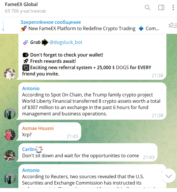 У проекта имеется телеграмм-канал FameExgroup с 69 000 подписчиками на 04.02.2025 года. В нем представлены новости со всего мира о криптовалюте, финансовых инвестициях. Разработчики сообщества дают возможность пользователям общаться между собой. Аудитория телеграмм-чата представлена англоязычными инвесторами.