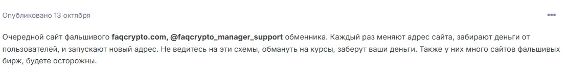 Кроме сайта других интернет-ресурсов у проекта не имеется. Есть аккаунт в Telegram с ником Faqcrypto manager support. Он используется службой поддержки в качестве контакта с клиентами. Иных способов связаться с представителями обменника не имеется, что наводит на мысли о скаме.