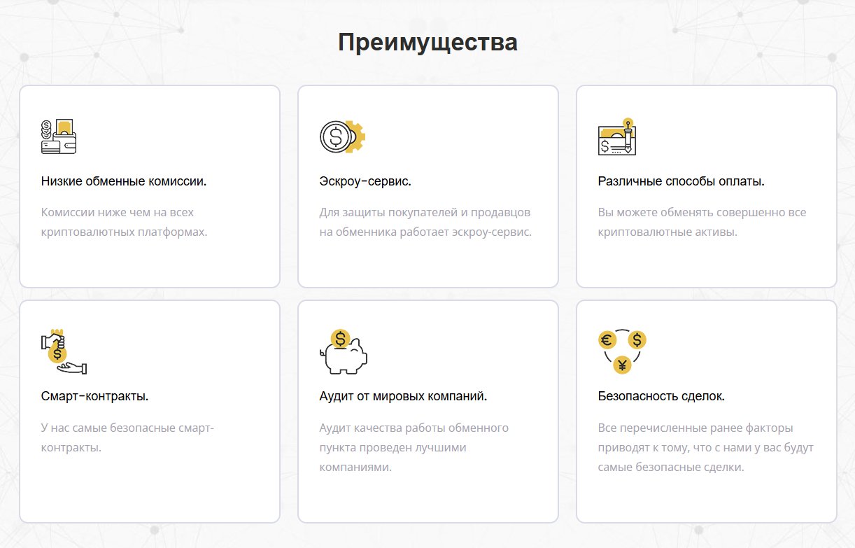 К преимуществам обменника Faqcrypto com его создатели относят низкие обменные комиссии, наличие сервиса защиты продавцов и покупателей формата “Эскроу”. У клиентов имеется возможность использовать различные способы оплаты, безопасные смарт-контакты. Им предоставляются гарантии безопасности сделок, сервис проводит аудит от мировых компаний.