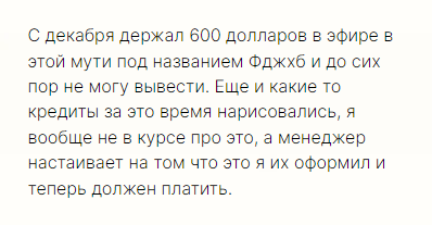 • Навязывание кредитов. Бывшие клиенты криптообменника рассказывают о том, что на них оформлялись кредиты без их ведома. Служба поддержки не может объяснить произошедшее. В случае неоплаты клиентам «Фджхб» начинают звонить с угрозами неизвестные.