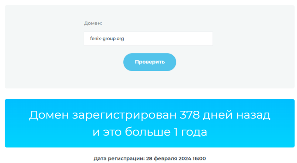 Основной ресурс проекта – Fenix Group org – появился в феврале 2024 года, согласно проверке через независимый сервис.