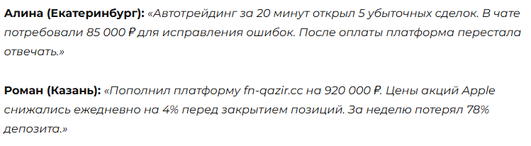 В сети появляются как единичные позитивные сообщения, так и значительное количество жалоб и предупреждений на профильных форумах, в отзовиках и видеоблогах. Среди зафиксированных кейсов в отзывах о Fenqazir vip — потеря депозитов при попытке вывода и требования дополнительных оплат.