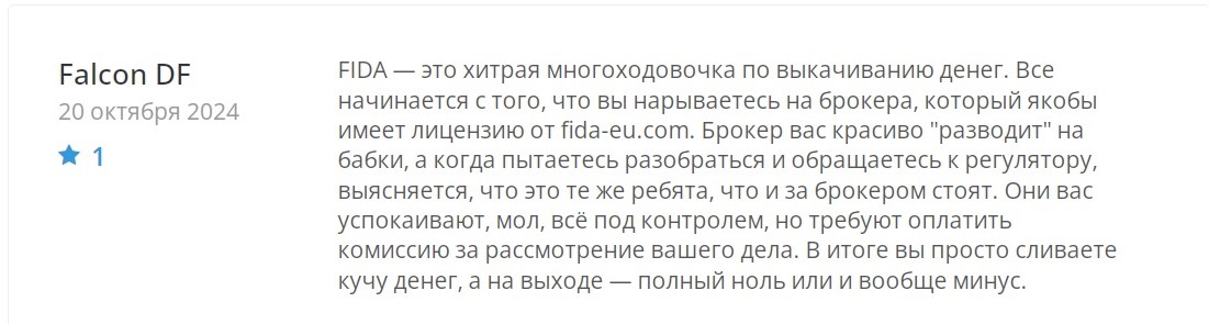 Комментариев о проекте мало и в основном относятся к 2024 году. Пользователи пишут о выманивании денег. Заявляют, что работает схема, когда лжеброкер получает фейковую лицензию на деятельность. Когда трейдер сталкивается с проблемой, так как не может выводить средства со счета, пополнять баланс, и обращается к регулятору, то не получает поддержки. Ему предлагают уплатить комиссию за предоставление услуги, но не решают вопросов по депозиту. На основании этого предполагают, что Fida – мошенник.