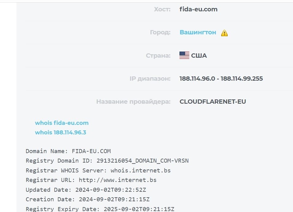 Проверка по сервису 2ip выдает сведения о регистрации веб-сайта fida eu com 2 сентября 2024 года сроком на один год.
