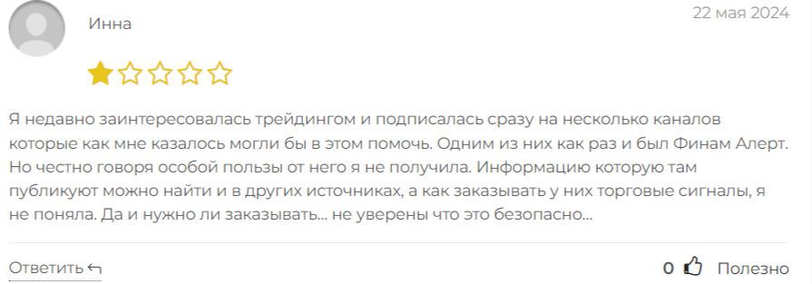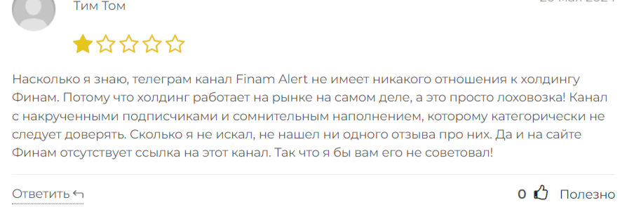 Много отрицательных отзывов в адрес телеграмм-канала Finam Alert, пользователи недовольны его контентом.