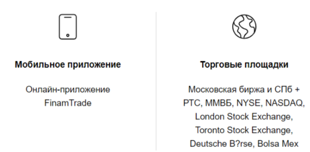 Покупать и продавать пользователи могут через приложение Finam Trade, также предусмотрено несколько торговых площадок. У брокера насчитывается 90 филиалов, что поднимает его репутацию и даже вызывает доверие.