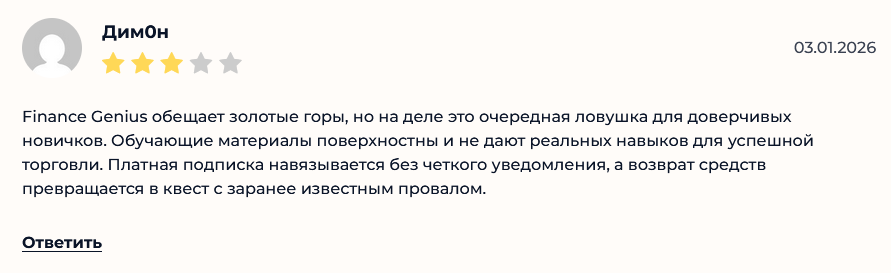 В той же соцсети работает группа FinanceGenius, в ней 444 участника на момент обзора. Однако новые посты здесь не выходят с августа 2025 года. И активность аудитории отсутствует.Что касается самой деятельности проекта, он завязан на бинарных опционах. Автор продвигает биржу Pocket Option, который внесена в список нелегальных Центральным банком России.