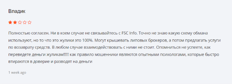Анализ отзывов про help FSC info us показал, что пользователи не доверяют регулятору. Трейдеры пишут, что компания лицензирует мошеннических брокеров, сотрудничает с ними. Регулятор предлагает свои услуги тем, кто хочет вернуть деньги.
