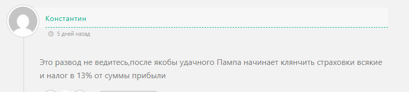 В поисках независимых отзывов, нам удалось обнаружить всего один комментарий и он был негативного характера. Его автор говорит об обмане. Суть: после, якобы, удачного пампа Валерия начинает выманивать деньги на всякие страховки и налог в 13% от прибыли. Но а когда у людей просто заканчиваются деньги или они отказываются платить поборы, админ удаляет таких с канала и вносит в черный список.