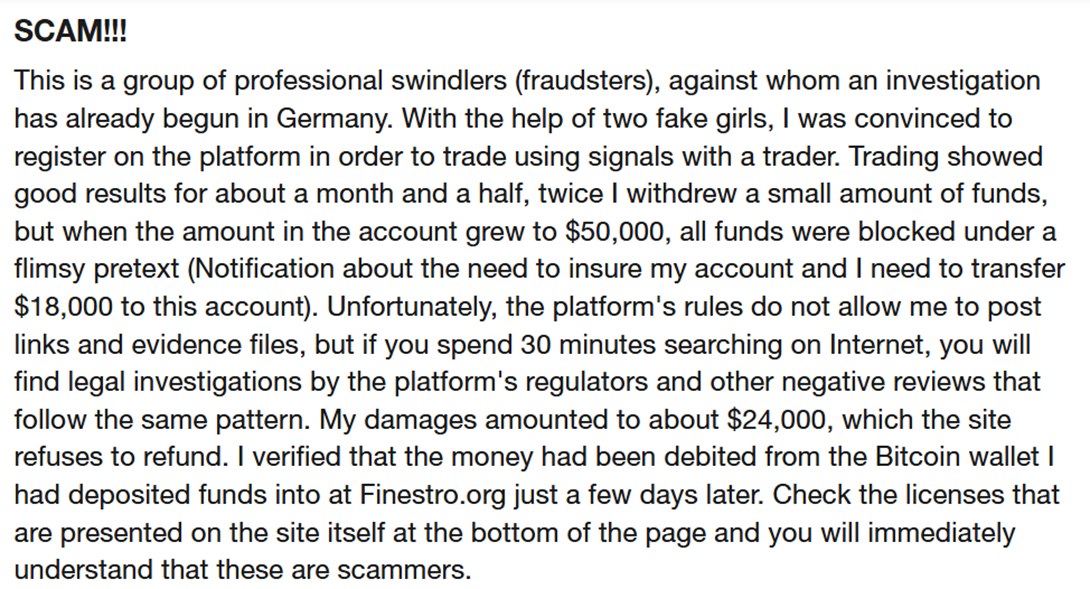 Опубликованные в сети отзывы и Finestro org подтверждают все описанные выше опасения. Тут действительно можно сделать вывод, что компания является мошенником. Многие утверждают, что столкнулись с проблемами с выплатой денег, их учетные записи были заблокированы без оснований и возникали прочие трудности. Отзывы о брокере встречаются и на зарубежных сайтах.