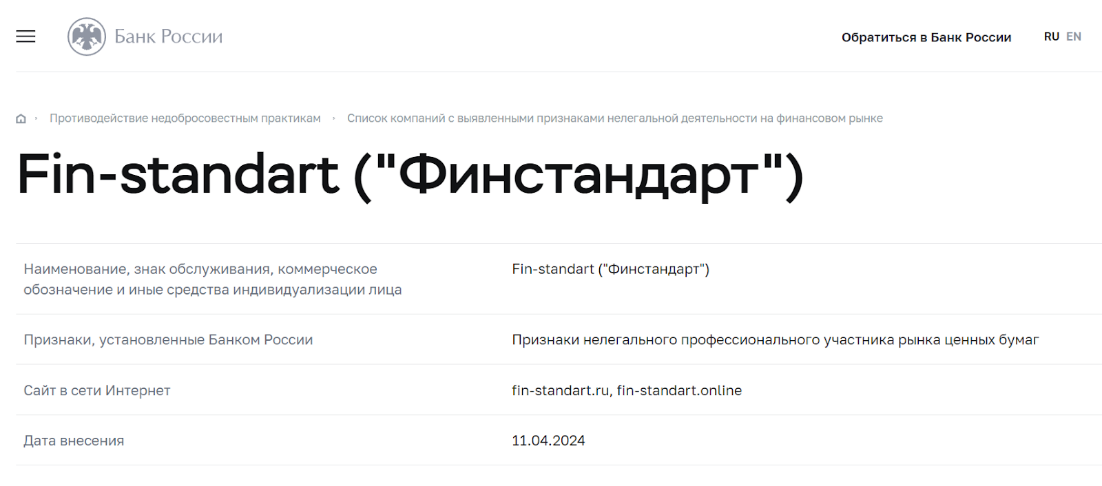 • Отсутствие сертификатов и помещение компании в черный список на официальном сайте ЦБ РФ. Это уже со 100% вероятностью подтверждает, что компания «ФинСтандарт» скорее всего является мошенниками.