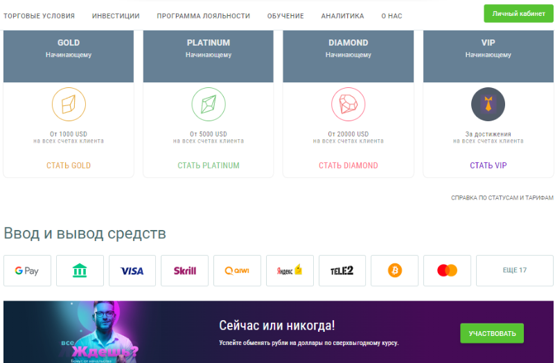 • VIP. Открывается после того, как пользователь достигнет определенных успехов в трейдинге. Подробности не раскрываются.