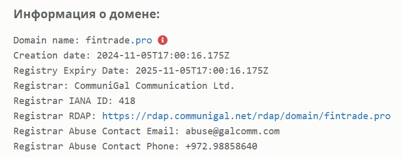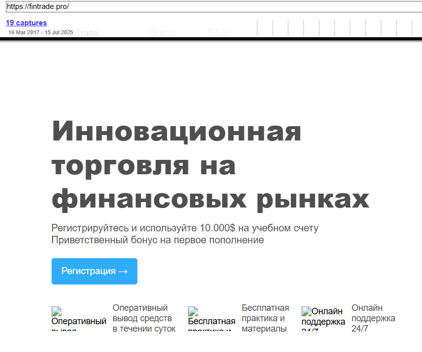 Это могло бы говорить о продолжительном сроке существования, но на сторонних ресурсах утверждают, что домен FinTrade pro создали еще в 2022 году, то есть, владельцы постоянно меняют адреса и регистрируют новые, а это выглядит подозрительно.