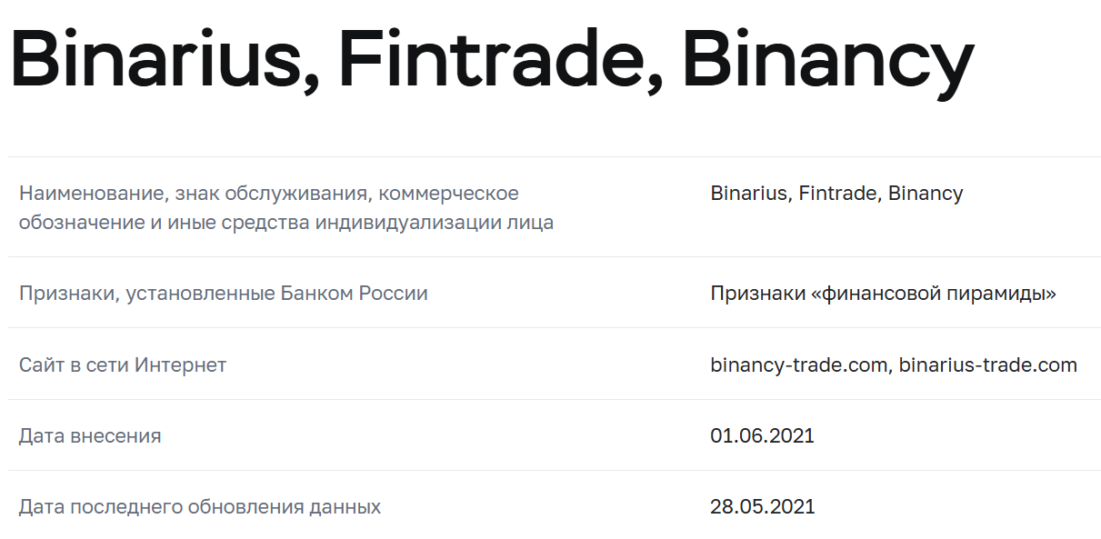 Брокер утверждал, что имеет лицензию ЦРОФР, но проверить это в 2025 году нельзя, зато ЦБ РФ считает проект финансовой пирамидой, причем рядом видно другие названия Binarius и Binancy, значит, владельцы действительно имели несколько доменов и постоянно их меняли.