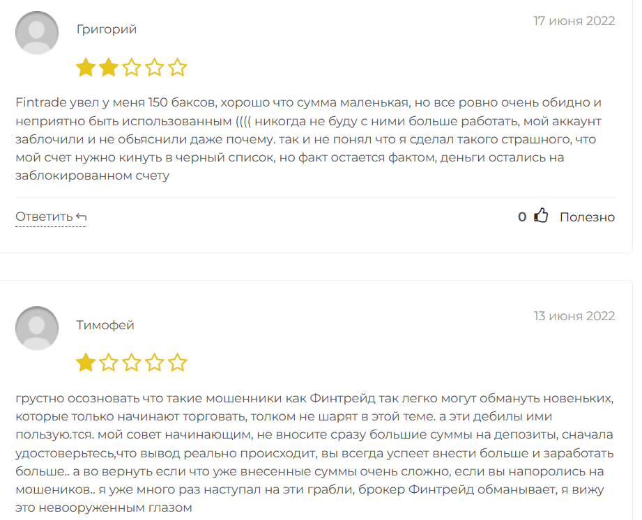 - В отзывах о «ФинТрейд» клиенты жалуются на блокировку счетов и невозможность вывода средств, а это может говорить о нечестной практике.