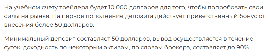 На сторонних источниках утверждают, что минимальная сумма пополнения составляла $50, причем при регистрации давали бонус в таком же размере, а также обещали прибыль по некоторым активам до 90%.