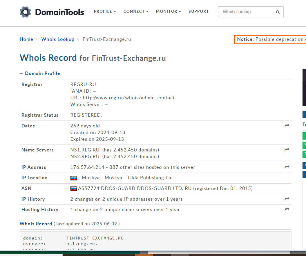Анализ домена FinTrust-Exchange.ru дает немало интересных зацепок. Сам домен молодой и по состоянию на 9 июня 2025 г. ему нет и года. Был зарегистрирован 13 сентября 2024 г. и потому “тысяча перестановок за 2 года” — уже не правда.