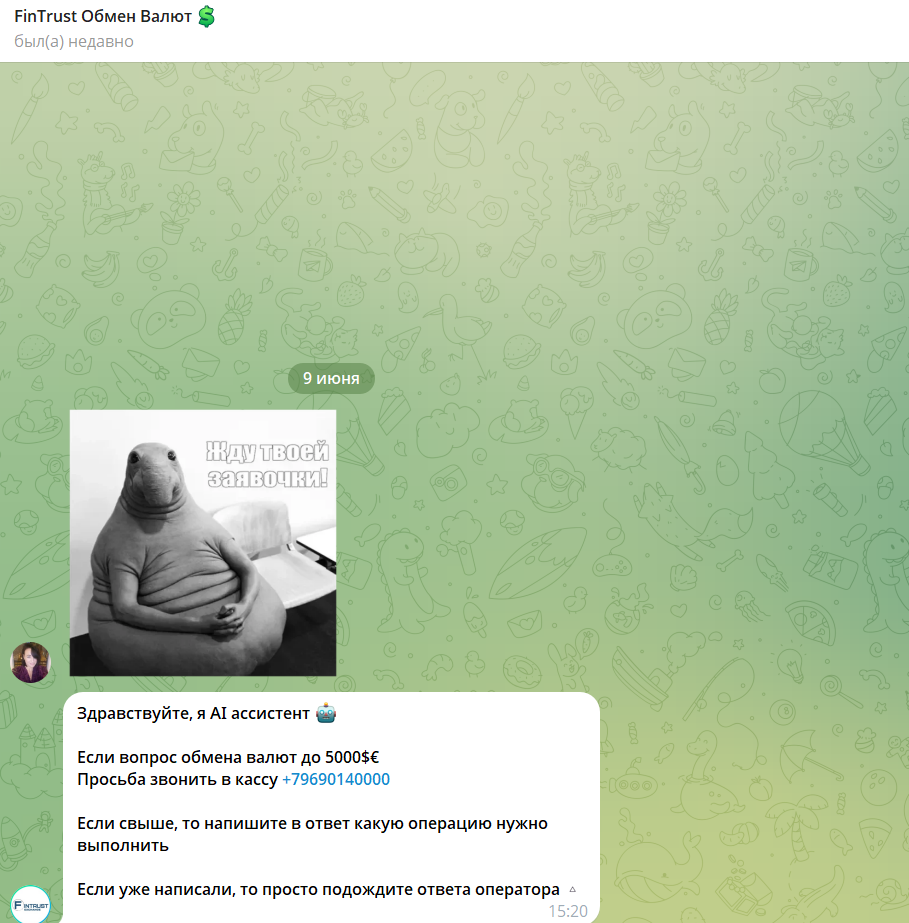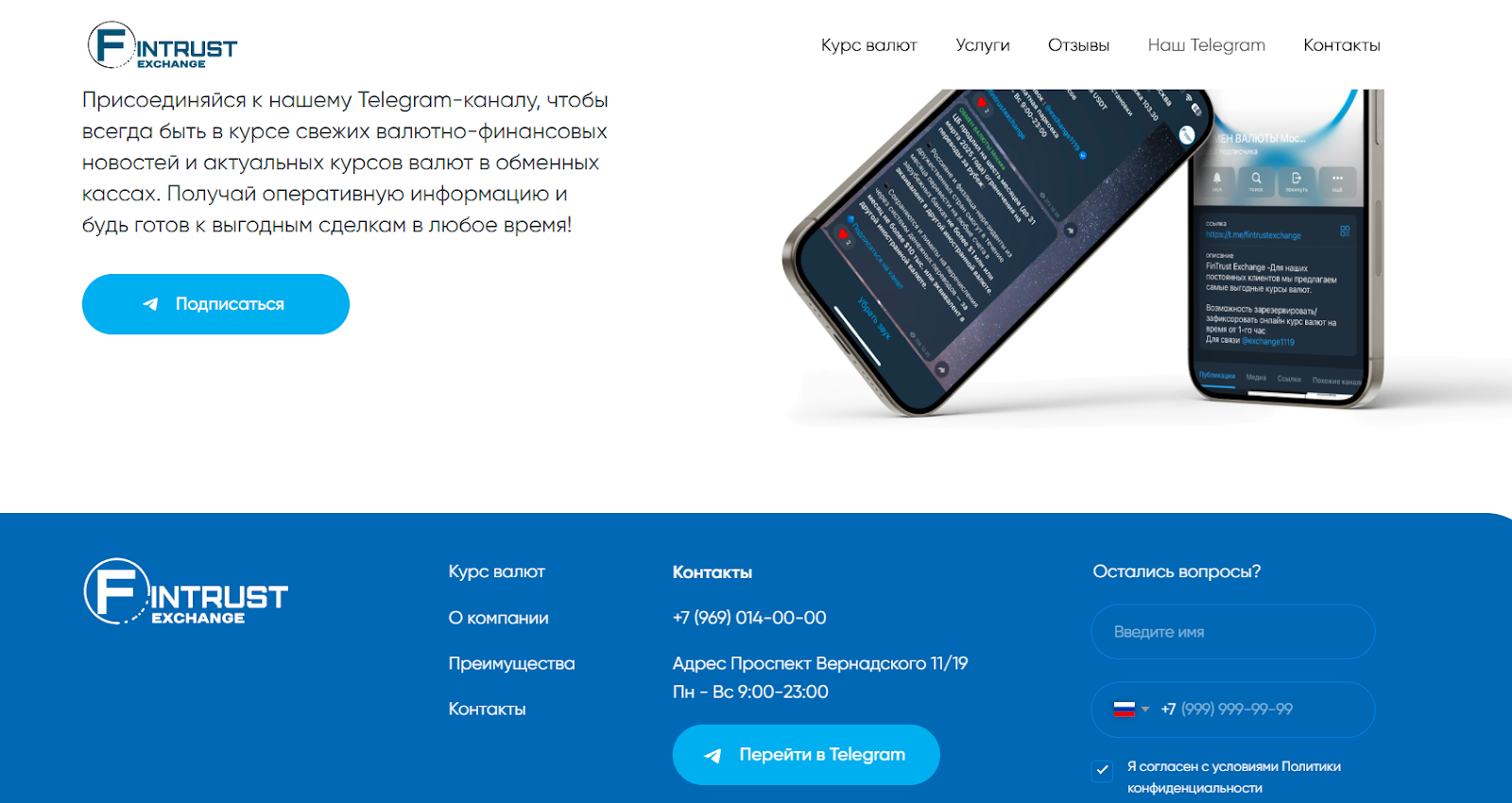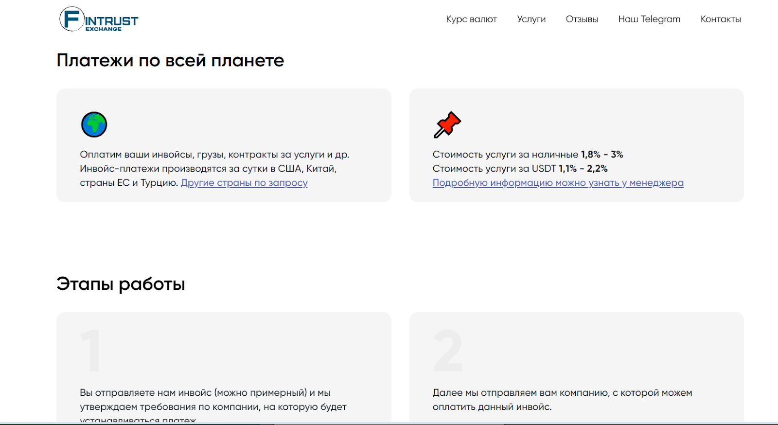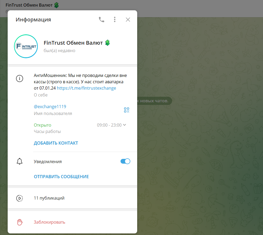 Заявленный режим работы обмена валюты Fintrust — с 9 утра до 11 вечера без выходных, но вся коммуникация идет через ТГ. На сайте присутствуют громкие заявления о безопасности, клиентоориентированности и даже “международных перестановках”.