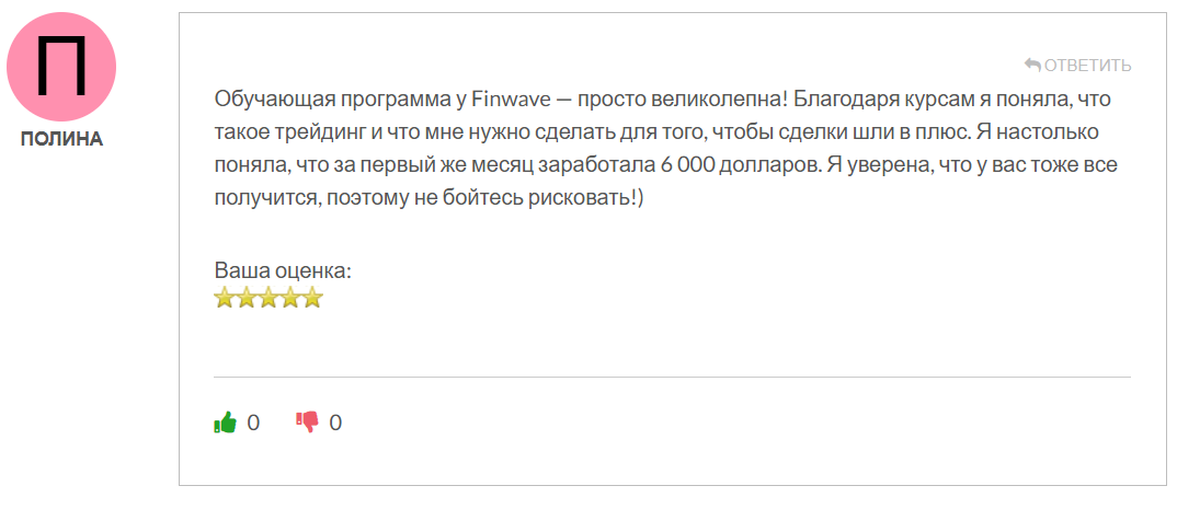 Полина написала положительный отзыв и сообщила о прекрасных условиях обучающей компании Fin Wave. Она пишет, что после курсов ей удалось понять трейдинг и начать совершать сделки с положительной тенденцией на Finwave. Полина сообщает, что за первый месяц заработала аж 6000$ и считает, что нужно не бояться рисков.