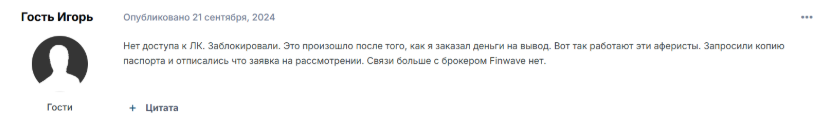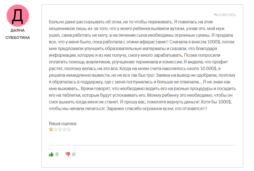 Под этим же обзоров есть множество отрицательных отзывов. Трейдеры предупреждают об опасностях и неоправданных рисках. Даяна Субботина написала, что ради лечения сына решила пойти на риск, чтобы исправить финансовую ситуацию. Она потеряла 1000$, затем ей предложили пройти обучение и оплатить помощь аналитиков и Даяна, увидев заработок, доверилась программе. При попытке вывода 10000$ она поняла, что брокер является мошенником, так как ее счет был заблокирован и она потеряла все заработанные и вложенные деньги с брокером Finwave.