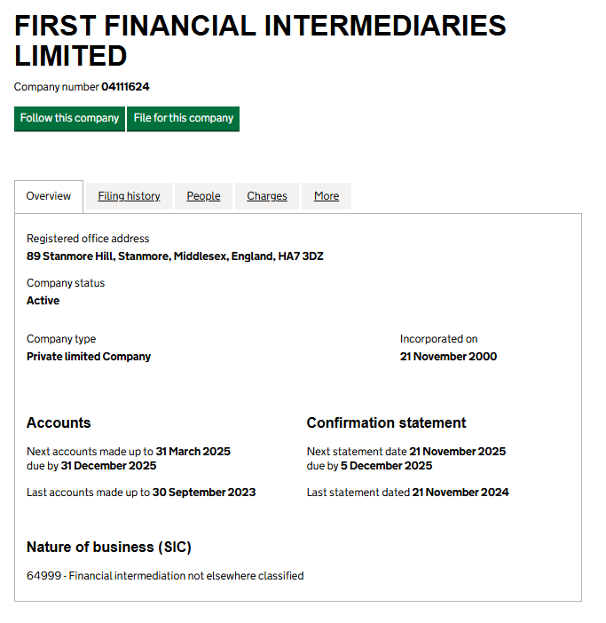 Заявлено, что офис First Financial Intermediaries Limited находится в Англии. Поэтому мы первым делом проверили записи в реестрах этого региона. Информация подтвердилась, компания с таким названием зарегистрирована в базе.