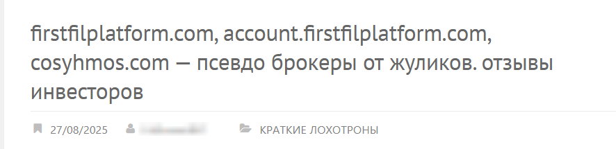 Других отзывов о account firstfilplatform com в сети нет, что кажется подозрительным. Компания брокера не обсуждается на форумах, о ней нет дополнительных сведений. Нам удалось обнаружить только обзоры на проект, в которых авторы связывают организацию с мошенничеством.