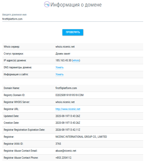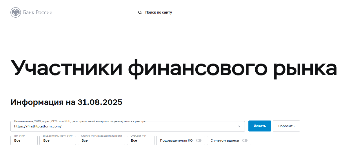 Домен firstfilplatform com был зарегистрирован в августе 2025 года, поэтому информация не подтвердилась. На сайте нет сведений о другом адресе для работы с брокером.