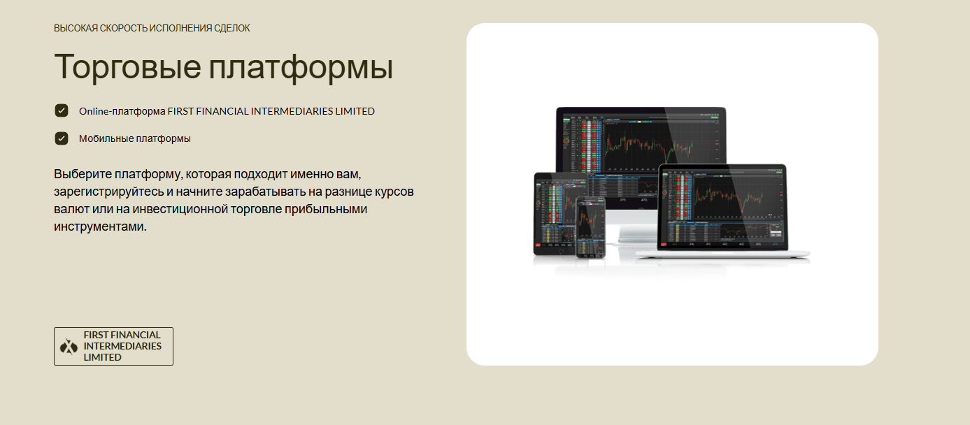 First Financial Intermediaries Limited – это брокер, предлагающий трейдерам торговать на валютных рынках. Компания заявляет о большом опыте и разнообразии платформ, доступных клиенту.