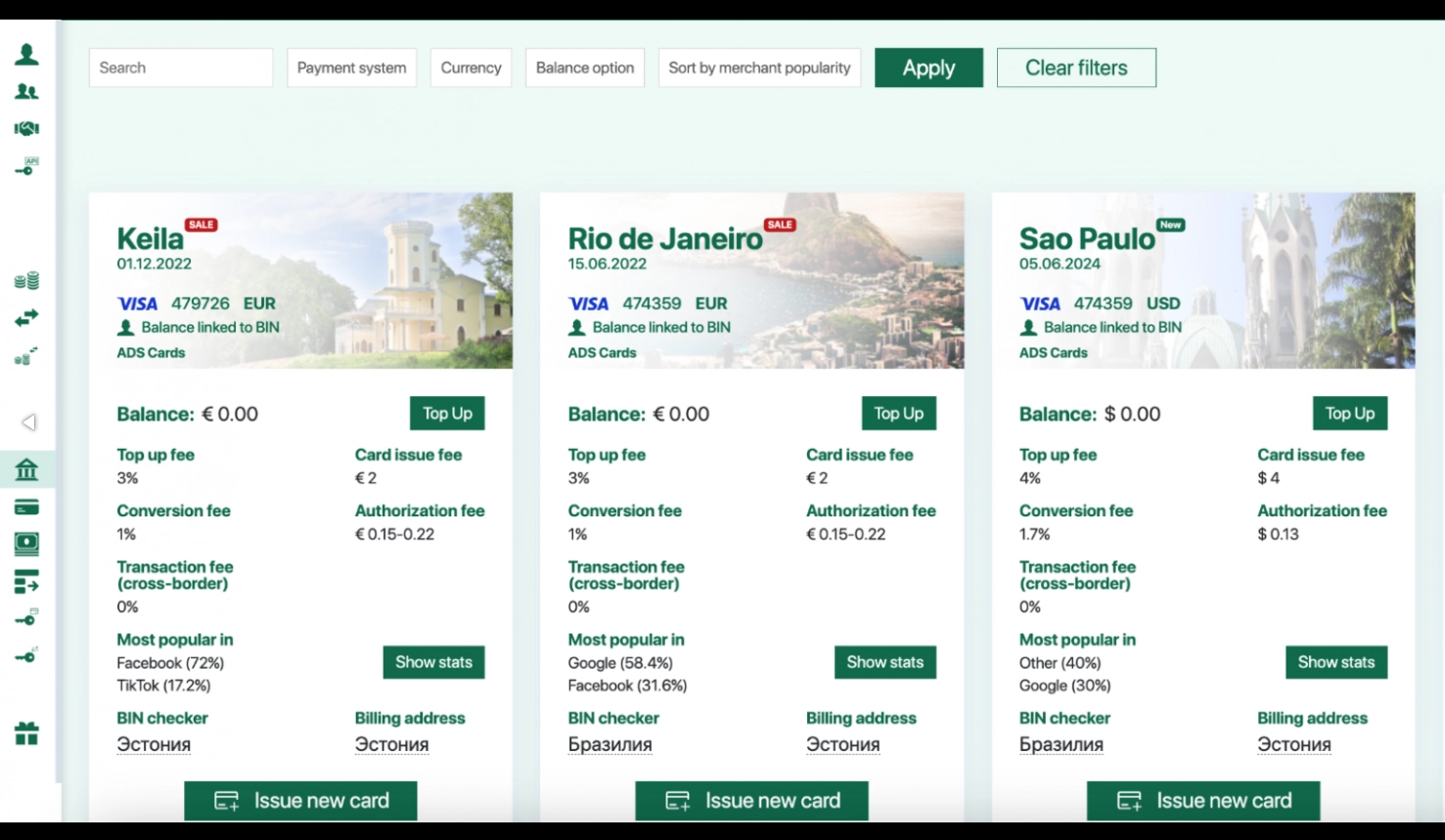 В целях экономии важно правильно выбрать Bin карты, ориентированный на конкретную валюту и локацию. Сервис предлагает 11 локаций в разных странах, всегда можно подобрать вариант в нужной валюте для конкретных рекламных кампаний.